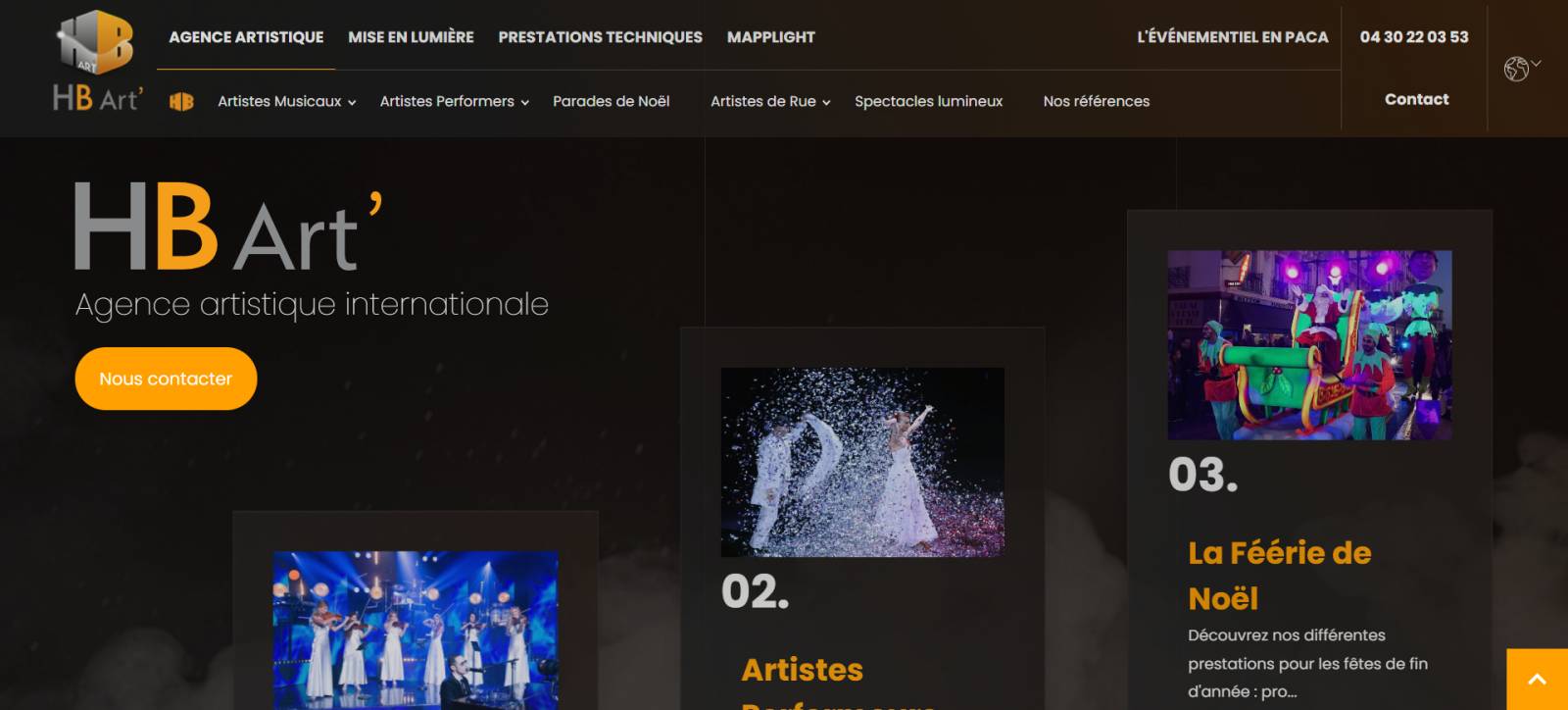 Parmi nos plus fidèles clients et partenaires, nous vous présentons l'agence événementielle HB Art', producteur de spectacle à Marseille. Client chez Jalis depuis quelques années, il a opté pour plusieurs sites thématisés mais aussi des sites multilingues, avec un site pour ses clients russes et un autre pour les anglophones. HB Art' est le spécialiste de l'organisation d'événements à Marseille mais aussi en PACA. Il produit des spectacles visuels et musicaux pour l'animation de soirées et événements (mariage, lancement de produit, inauguration de lieux, anniversaire...) toujours avec grand succès. Il peut également être votre prestataire technique pour vos événementiels en région PACA en vous permettant de louer tout le matériel d'animation nécessaire comme la sono, les effets spéciaux et les jeux de lumière.