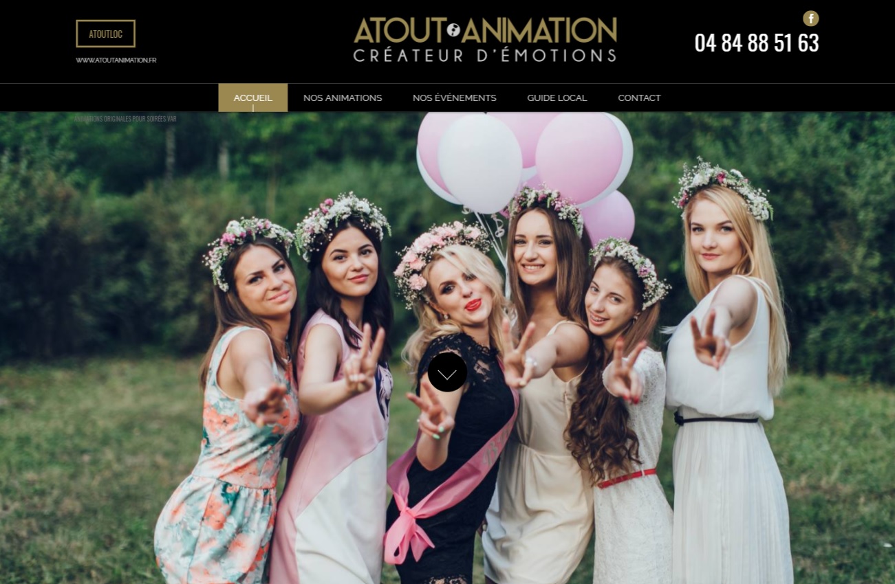 Noir, blanc et or, des couleurs sobres et nobles pour le site de l'agence artistique de Six Fours Les Plages, Atout Animation. Chez Jalis, nous lui avons réalisé un site vitrine élégant, le client peut ainsi présenter les animations qu'il propose pour des soirées ou des événements privés et professionnels. Il communique également sur les événements qu'il peut couvrir.