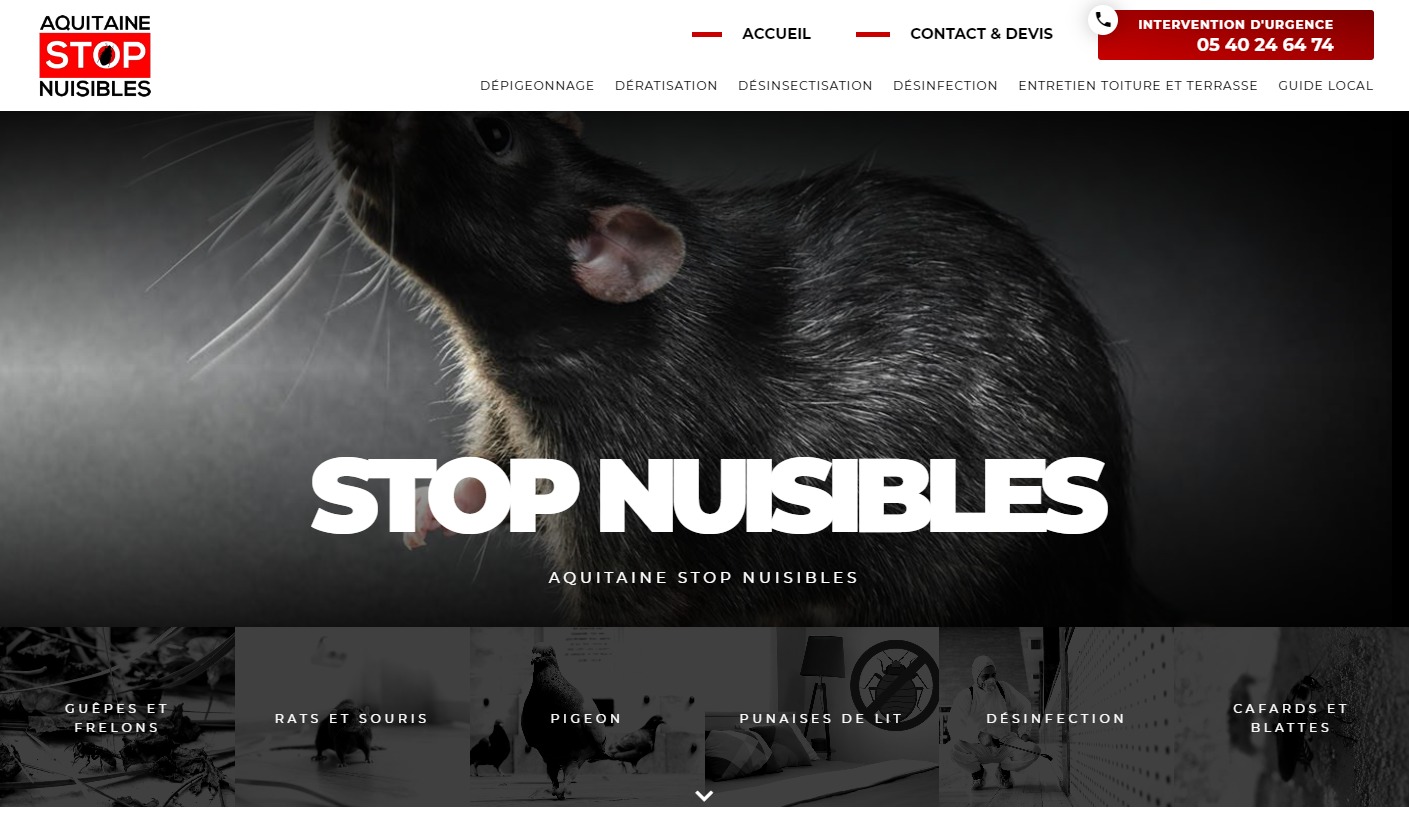 L'entreprise Aquitaine Stop Nuisibles est spécialisée dans la lutte contre les insectes nuisibles en Gironde. Basée à Mérignac, elle se déplace chez les particuliers et les professionnels de tout le département : Bordeaux, Pessac, Libourne et même jusqu'au Bassin d'Arcachon. Grâce à leurs compétences et leurs méthodes 100% efficaces, vous serez certains d'être débarrassé des pigeons, des rats, souris, mulots ainsi que des insectes nuisibles (blattes, cafards, punaises de lit, guêpes, frelons, etc.). Contactez-les sans plus attendre pour demander un devis sur mesure et demander une intervention rapide.