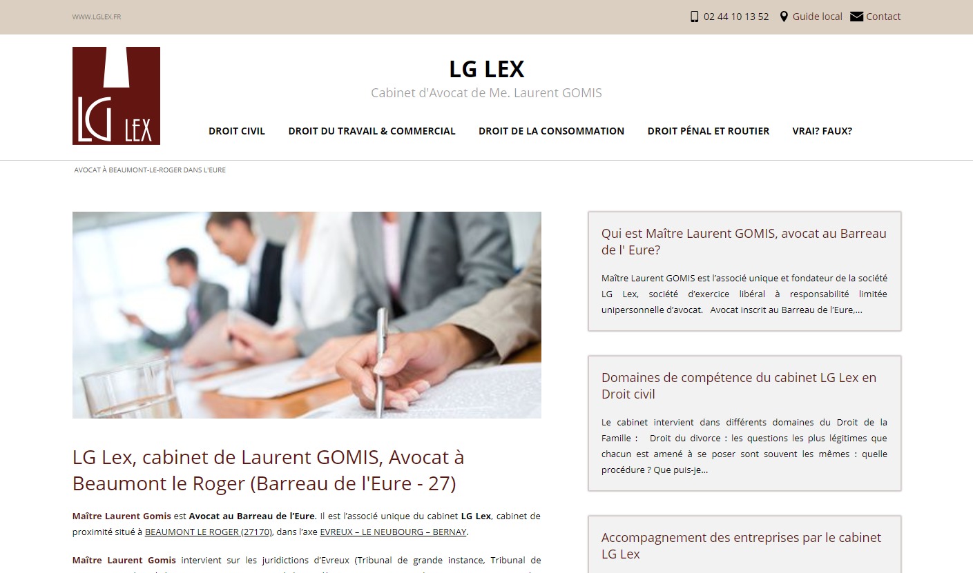 LG Lex est un cabinet d'avocat intervenant pour des affaires variées. Situé à Beaumont-le-Roger, dans le département de l'Eure, vous pouvez faire appel au cabinet de Maître Laurent Gomis si vous recherchez un avocat pour un divorce à Évreux ou ses environs, pour obtenir la garde exclusive ou partagée d'un enfant, pour un non-paiement d'une pension alimentaire... Ce cabinet intervient également dans des affaires relevant du droit du travail, du droit pénal, et du droit commercial et des sociétés.