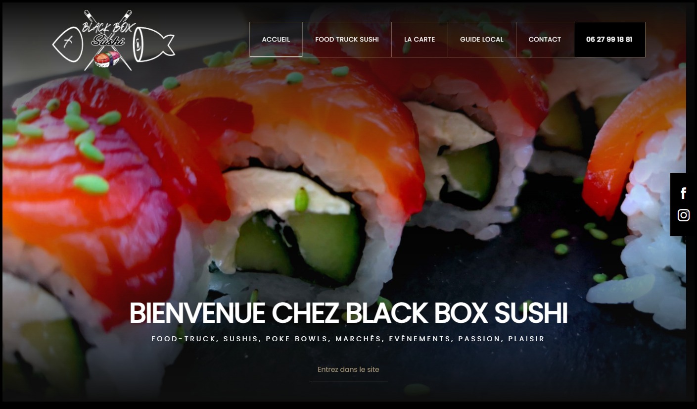 Black Box Sushi est le food truck spécialiste des sushis à emporter et traiteur mariage dans les villes du Var. Le food truck se déplace sur les marchés la semaine. Des prestations événementielles sont également possibles pour les événements professionnels, particuliers, festivals... Le client souhaite développer la partie évènementielle en priorité. Le nouveau site internet permet à Black Box Sushi de mettre la carte à disposition des internautes du Var.