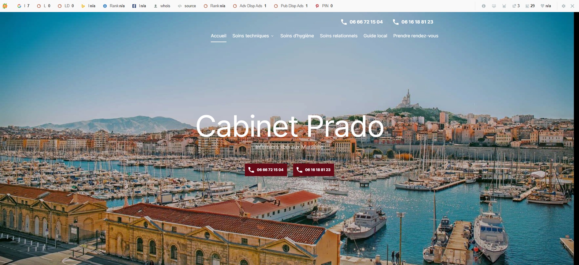 Il dispose d’un site web en conformité avec la Charte de L'Ordre National des Infirmiers lui permettant de développer sa patientèle sur sa zone géographique d’intervention.Création de site internet, hébergement, référencement naturel : nous offrons une visibilité affinée. Vous êtes à la recherche d’une infirmière libérale à domicile dans le 6e arrondissement de Marseille ? Rendez-vous sur le site du cabinet Prado !