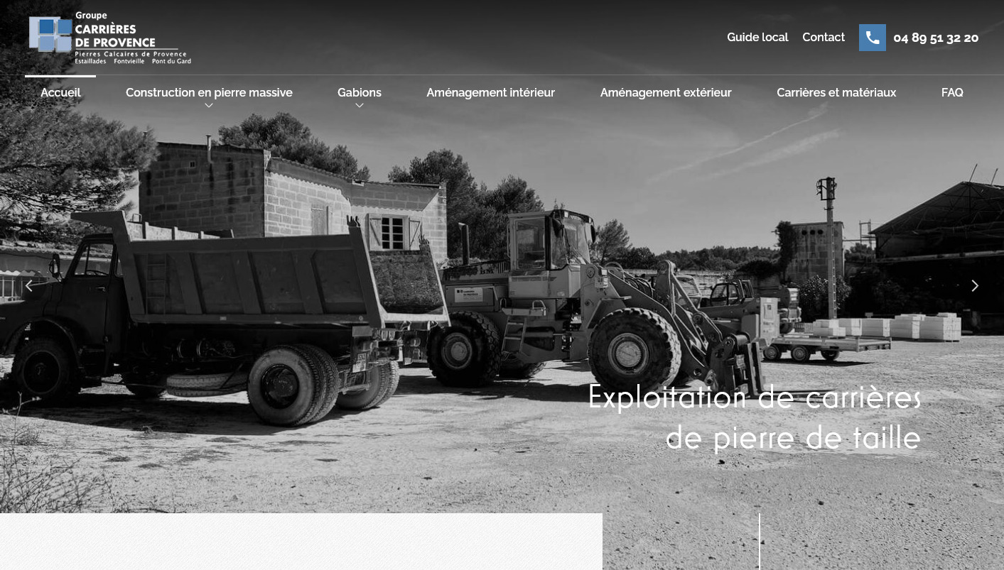 La région de la Provence regorge de ressources naturelles exceptionnelles pour l'art de la construction avec des pierres calcaires qui sont utilisées pour de la construction en pierre massive et la création de gabions pour les aménagements urbains. Carrières de Provence extrait la roche dans 3 carrières : la carrière des Estaillades, de Fontvieille et du Pont-du-Gard. La pierre est ensuite taillée pour la création de dalles, de margelles de piscines, de piliers et autres éléments d'aménagements extérieurs.