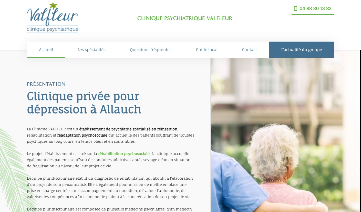Vous recherchez une clinique psychiatrique sur Allauch ? L'établissement Valfleur est privé et élabore des programmes de soins personnalisés, de sorte à ce que chaque patient soit suivi du mieux possible. Il est notamment spécialisé dans la réhabilitation psychosociale de personnes atteintes de troubles psychiques tels que la dépression, l'addiction ou encore la schizophrénie.
