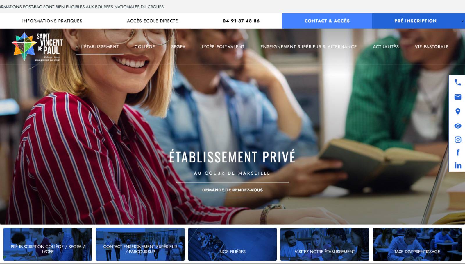Pour obtenir davantage de visibilité, l'établissement d'enseignement privé Saint Vincent de Paul à Marseille 6e a décidé de confier la réalisation de son nouveau site internet à l'agence Jalis. Spécialisée dans le référencement, notre agence fait profiter à ses clients d'outils exclusifs qui leur permettent de générer du contenu optimisé pour les moteurs de recherche en quelques clics. Découvrez les offres Jalis qui s'adressent aussi bien aux entreprises qu'aux associations ou instituts d'enseignement.