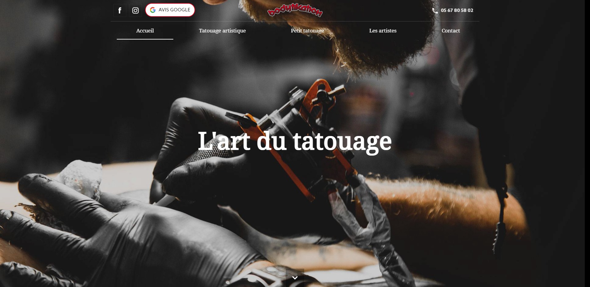 Le salon de tatouage BODYFIKATION à Talence nous a ainsi confié la création de son site internet sur-mesure. Découvrez ses tatouages artistiques. Vous apprécierez son portefolio riche de style. Et si c'était le moment parfait pour vous lancer dans un tatouagejaponais, manga, minimaliste, géométrique ou floral ?