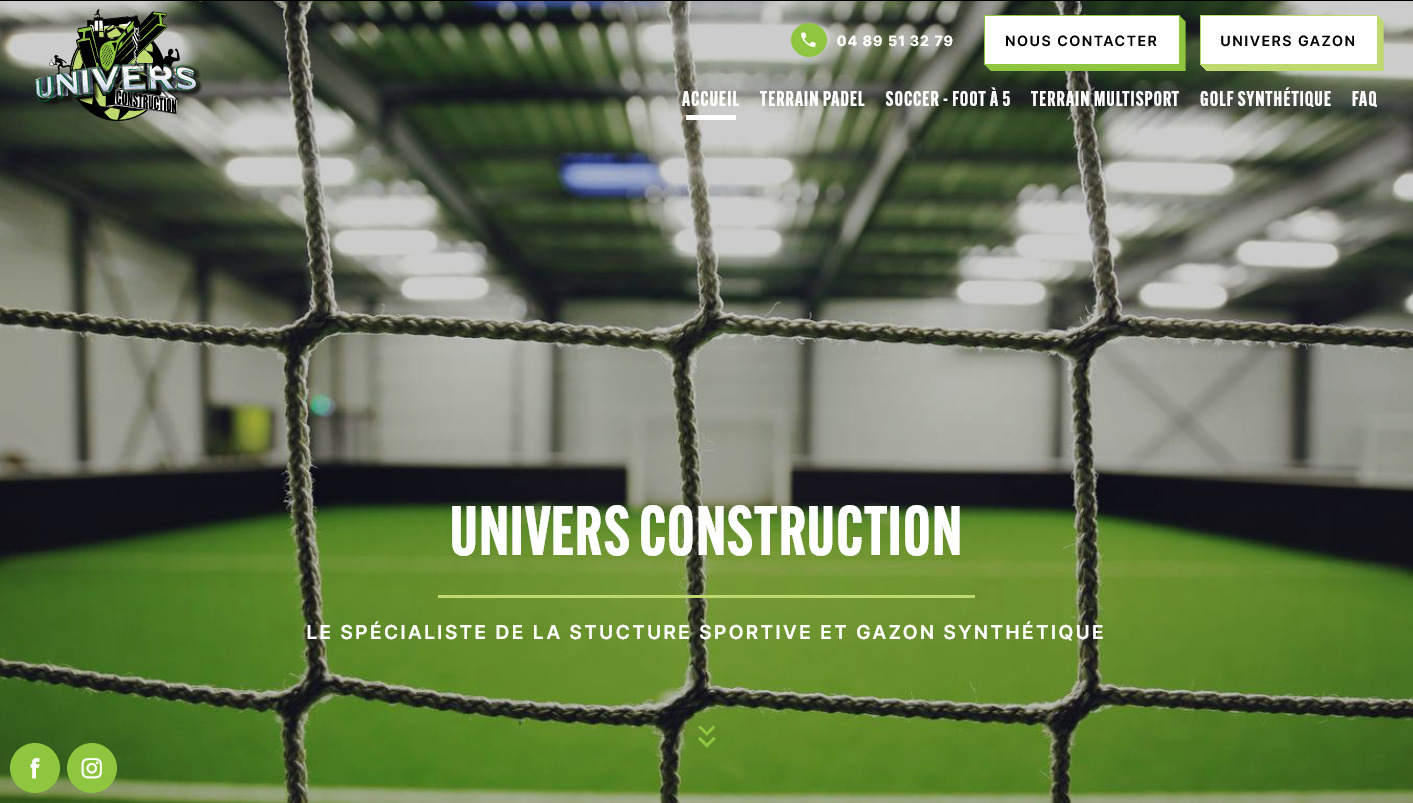 Univers Construction a choisi notre solution pour sa promotion online. Leurs experts fabriquent des gazons synthétiques pour terrains sportifs à Paris, Marseille et l'ensemble de la France. Vous pourrez également faire appel à eux pour bénéficier d'un terrain de football en salle, de golf ou encore de padel. Sa maitrise des gazons et autres surfaces synthétiques lui permet de réaliser de nombreux terrains multisports, pour une utilisation aussi bien en indoor qu'en outdoor.