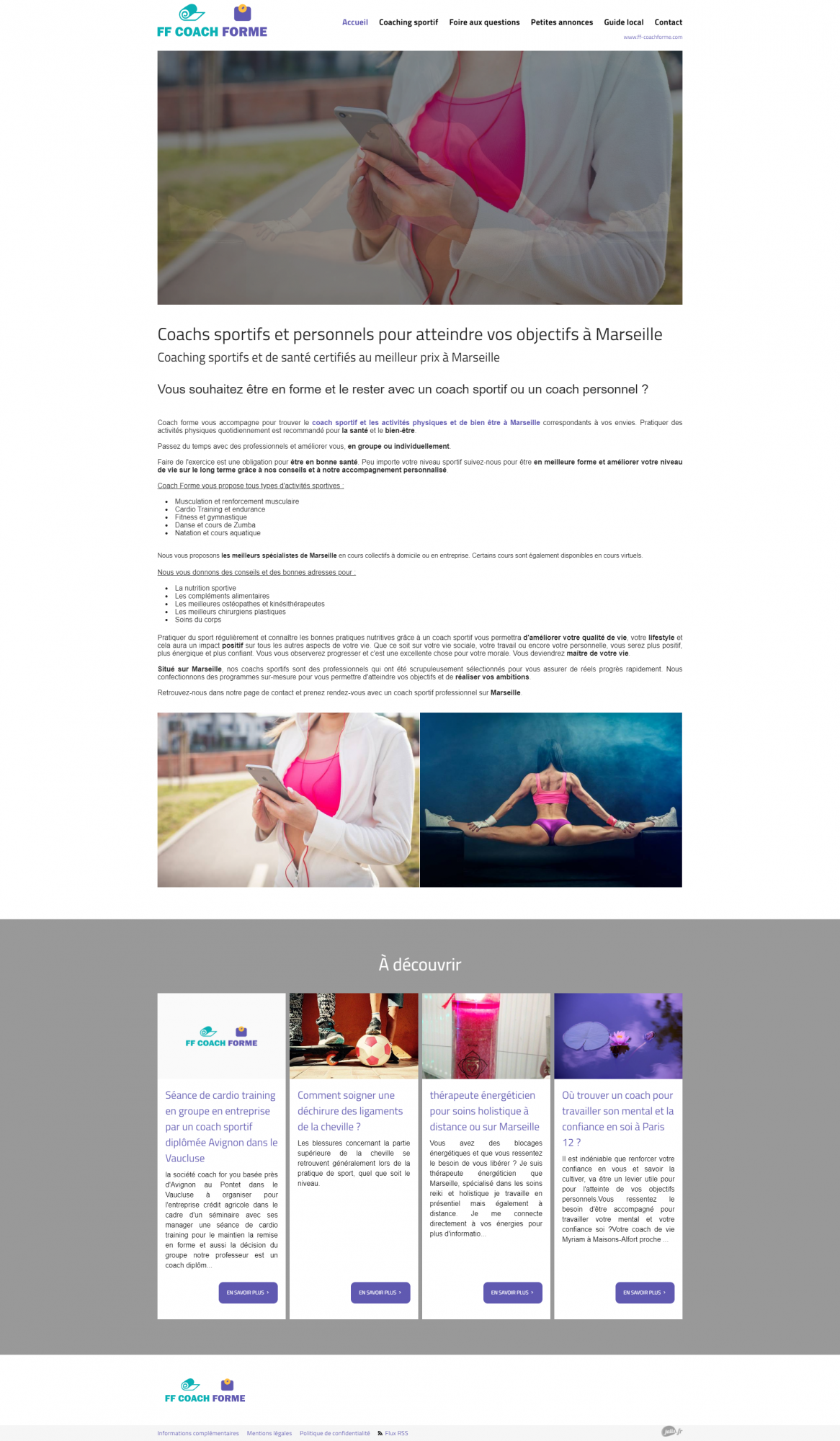 L'entreprise ff-coachforme.com propose tous types de services dans le sport et le bien-être. L'entreprise met à disposition des contacts, des bons plans et des coachs experts dans le sport ou dans le bien-être. Ils proposent aussi des services médicaux pour déstresser, relaxer vos articulations, ou vous faire masser. Visitez leur site internet pour en savoir plus.