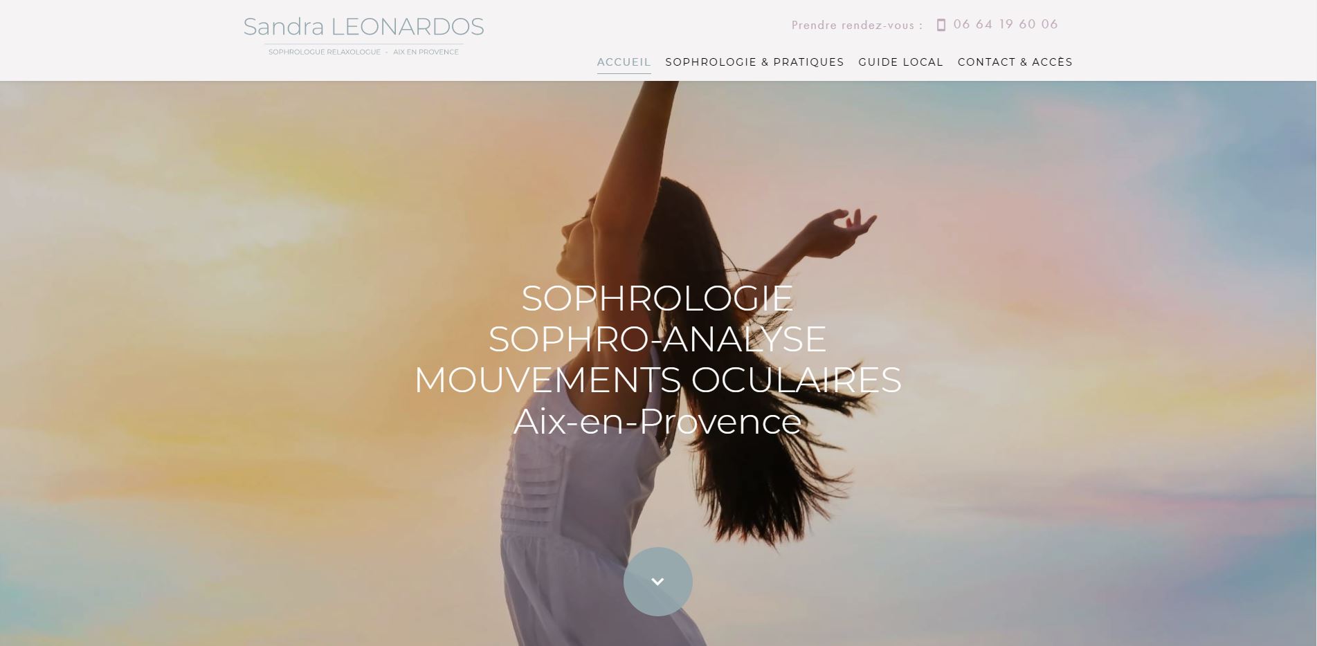 Avec la complicité de nos experts digitaux, elle dispose d’un site vitrine en responsive design à la fois dynamique et performant lui permettant de mettre en avant sa pratique de la sophrologie sur Aix-en-Provence. Chaque personne désireuse de trouver une réponse à ses maux, peut consulter son site afin d’en savoir plus sur l’accompagnement qu’elle propose. Sandra Leonardos est une sophro-analyste reconnue. Rendez-vous sur son site internet pour retrouver l’ensemble des témoignages de ses clients et découvrez des exercices de sophrologie pour vous aider à mieux gérer votre stress et anxiété !