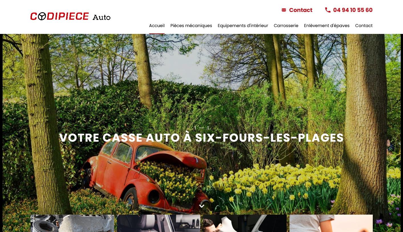 Pour la réalisation de son nouveau site internet, Codipièce a choisi Jalis. Notre agence web dans le Var met à sa disposition un site de gamme e-lite, où il présente l'ensemble de ses prestations et bénéficie d'un référencement géolocalisé. Épaviste, centre VHU agréé et casse auto : Codipièce est spécialisé dans l'enlèvement d'épave, la dépollution et destruction de véhicule hors d'usage et la vente de pièces détachées d'occasion.