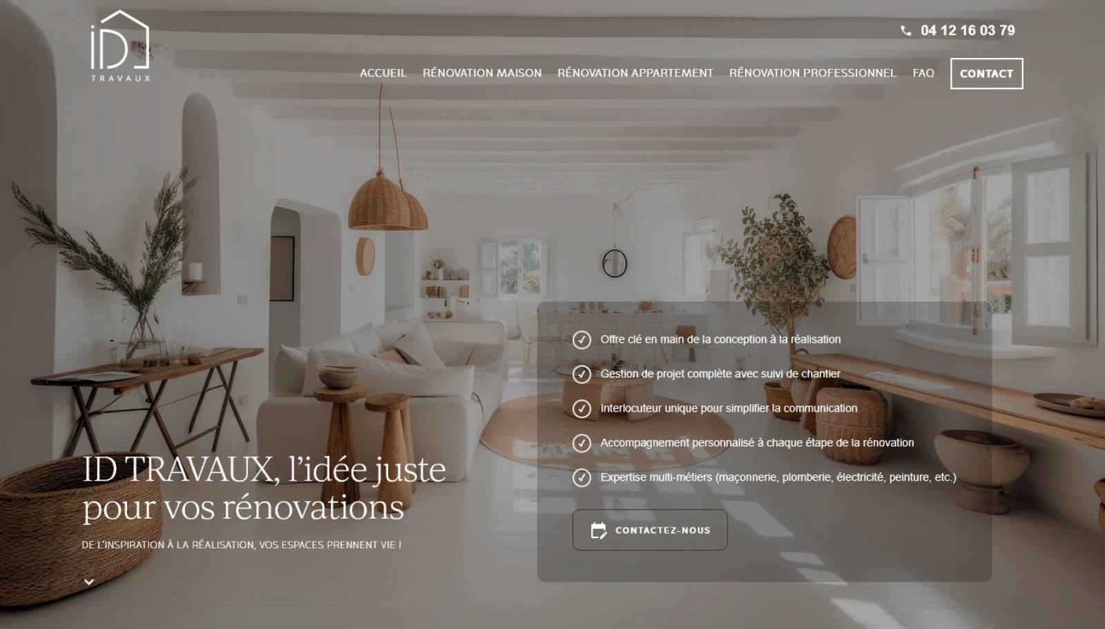 ID Travaux est une entreprise de rénovation basée à Martigues, spécialisée dans la réalisation de projets sur mesure pour les particuliers comme pour les professionnels. Elle intervient aussi bien sur des rénovations partielles que sur des rénovations complètes, en assurant une prise en charge globale du chantier, de l’étude initiale jusqu’aux finitions. Son approche repose sur la proximité, la transparence et la maîtrise technique de chaque corps de métier.