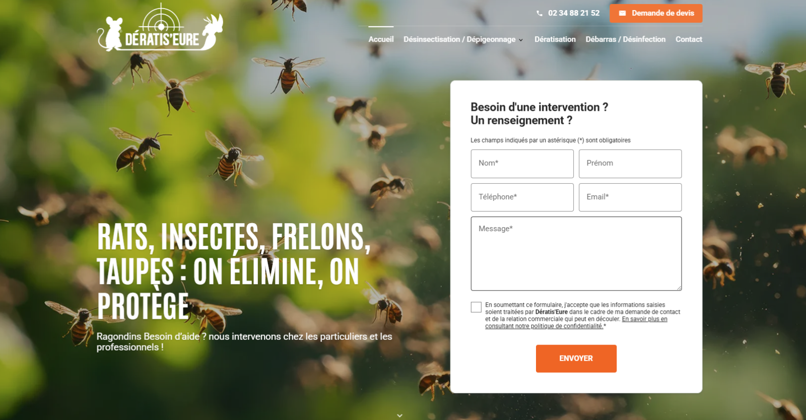 Grâce à un traitement anti rongeurs ciblé et des contrats de maintenance réguliers, ils assurent une protection durable contre les rats, souris ou ragondins. Leur site web reflète leur sérieux : prise de contact rapide, devis clairs, mise en avant de leurs services en urgence et sur tous types de bâtiments. Une vitrine digitale à la hauteur de leur savoir-faire et de leur engagement de proximité.