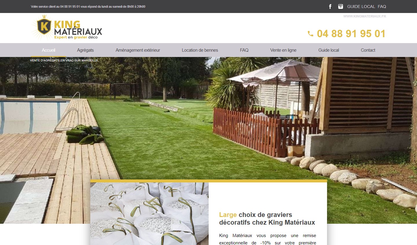 King Matériaux a fait appel à Jalis pour la conception de son site web dédié à la présentation de ses produits d'aménagement extérieur, ses prestations de vente et livraison d'agrégats sur Aix-Marseille. Jalis est spécialisté de la réalisation de sites web pour magasins et boutiques dans la région de Marseille. Sa solution, facile à prendre en main, permet au client de se positionner rapidement sur Google et obtenir des contacts qualifiés.