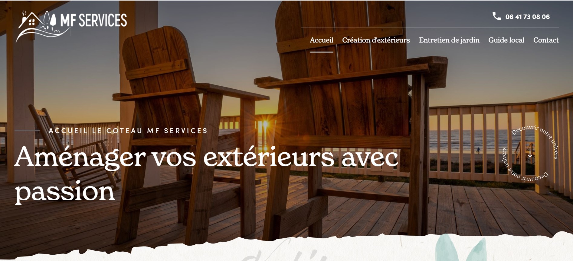 Si vous êtes un jardinier paysagiste à la recherche d'une agence web pour vous accompagner dans la création et la mise en ligne de votre site internet, faites appel à Jalis ! Nous proposons des offres sur-mesure adaptées à votre activité, et nous vous accompagnons tout au long du projet pour vous garantir une stratégie digitale efficace et une présence en ligne optimale. Contactez-nous pour en savoir plus sur nos offres et nos services, ou rendez-vous sur notre page dédiée aux jardiniers paysagistes. MF Services est spécialisé dans la création et l'entretien de jardins. Nous proposons également des prestations de paysagisme pour embellir vos extérieurs. Nos jardiniers paysagistes interviennent à Roanne (42) et dans les environs. Pour plus d'informations, contactez-nous au 06 41 73 08 06.