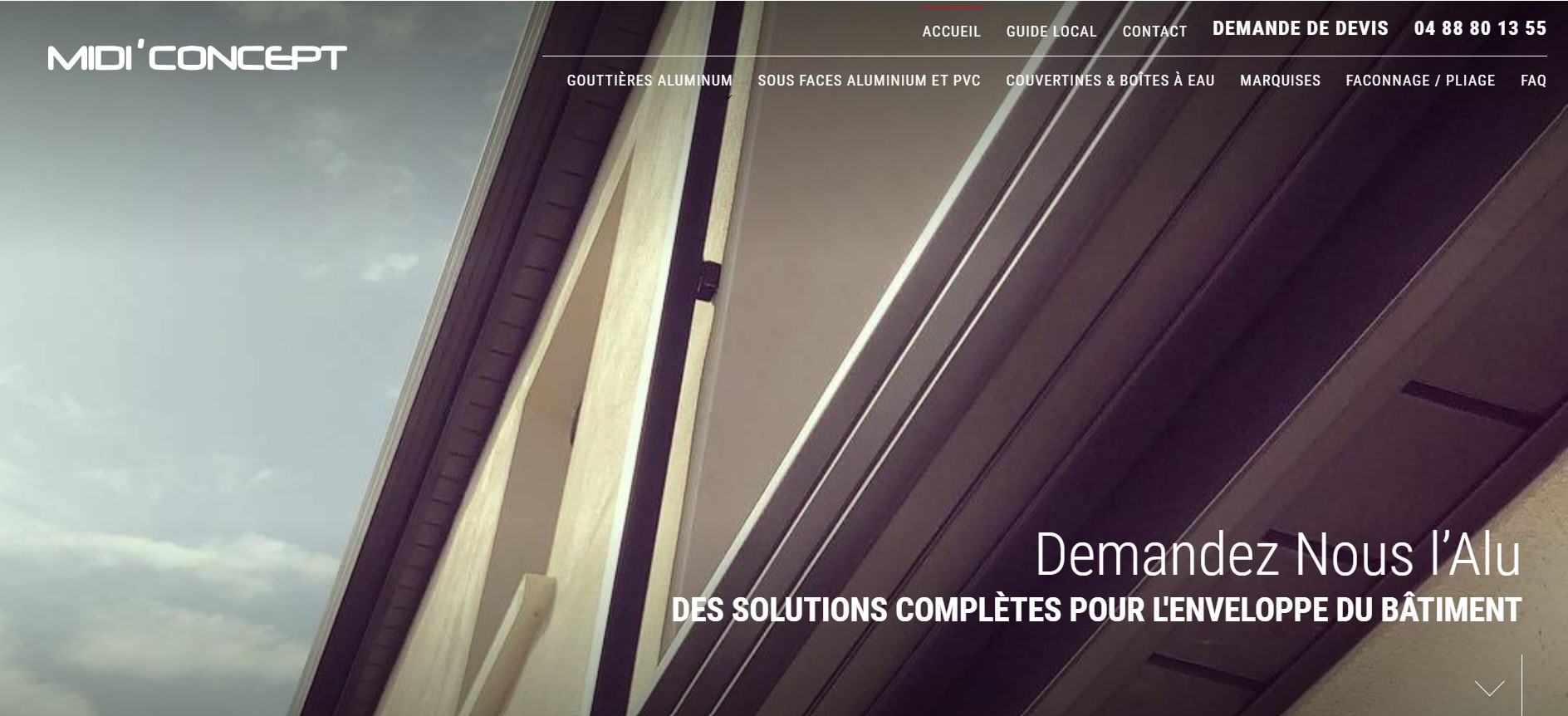 Midi Concept, cest un artisan agréé Dal'alu et spécialisé dans la fabrication et la pose de gouttières en aluminium à Nîmes dans le Gard. C'est tout naturellement que le distributeur de la marque Dal'Alu a confié à Jalis la création de son wite web.