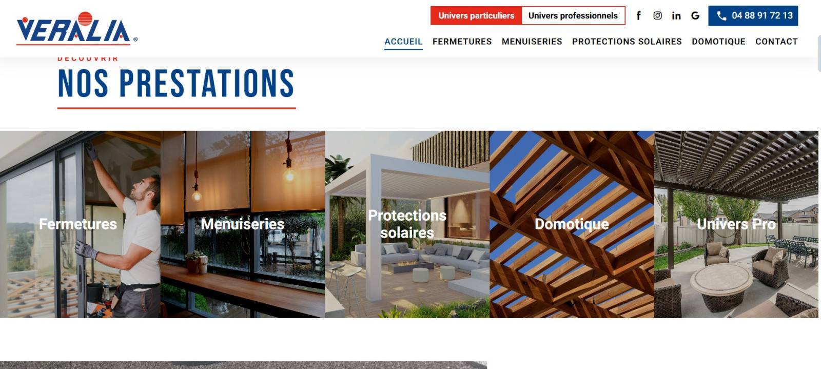 L'entreprise Véralia dans le Gard nous a fait confiance en s'équipant d'un site de la gamme eFlex qui lui permet de mettre en avant les photos de ses réalisations. Dans le domaine de l'artisanat et notamment de la menuiserie haut de gamme, il est en effet intéressant et pertinent de montrer ses créations en plein écran. Ici, la société a choisi des rubriques précises afin de présenter clairement les fermetures, les protections solaires et toutes les autres poses de menuiserie PVC et alu autour de Nîmes. Notre solution lui offre aussi de se positionner sur Google sur une zone de chalandises plus large avec un référencement géolocalisé.