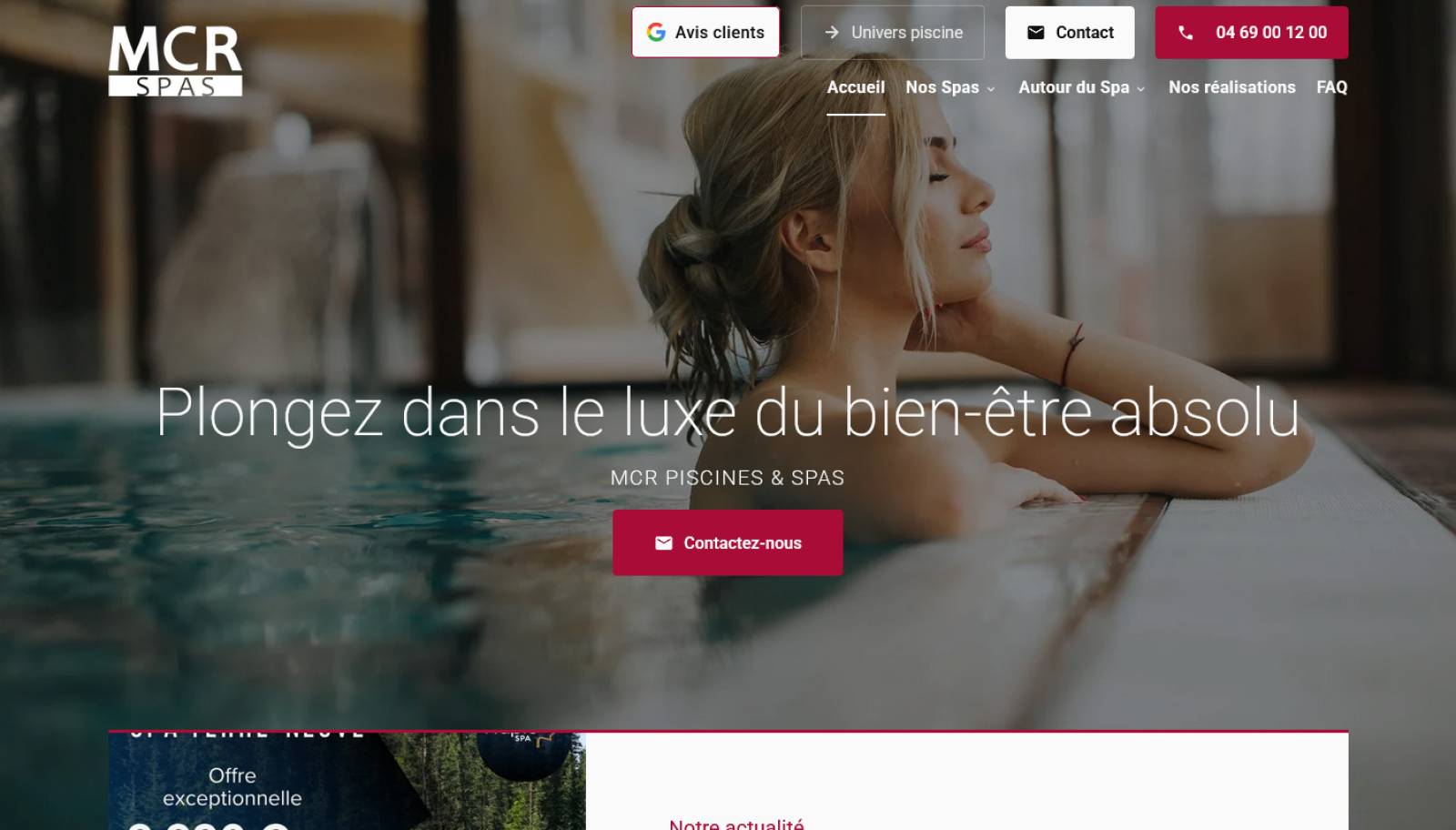 Spécialisée dans le spa, elle propose notamment la vente et l'installation de spas d'intérieur ou d'extérieur, de spas de nage, de spas avec jet de massage, et bien d'autres types de bains à remous pour votre bien-être et pour s'offrir un moment de relaxation. Profitez de son expertise pour vous faire conseiller, et pour découvrir de nombreux modèles de grandes marques européennes, canadiennes ou américaines. MCR Spas est aussi disponible pour dépannage, réparation et SAV.