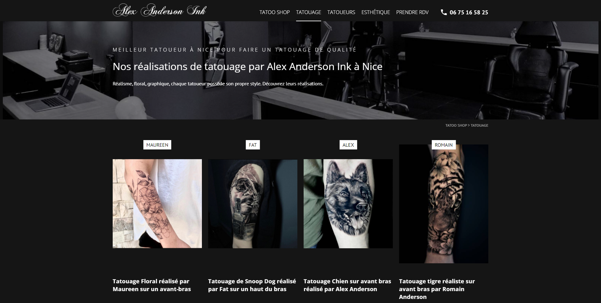 Alex Anderson Ink est un salon de tatouage situé à Nice. Depuis plusieurs années, les tatoueurs de ce Tatoo shop réalise du tatouage tribal, floral, graphique, réaliste, d'une qualité irréprochable. Le résultat est magnifique. Afin de mettre leur travail en avant auprès des internautes, c'est avec Jalis qu'ils ont décidé de créer leur site internet optimisé pour le SEO.
