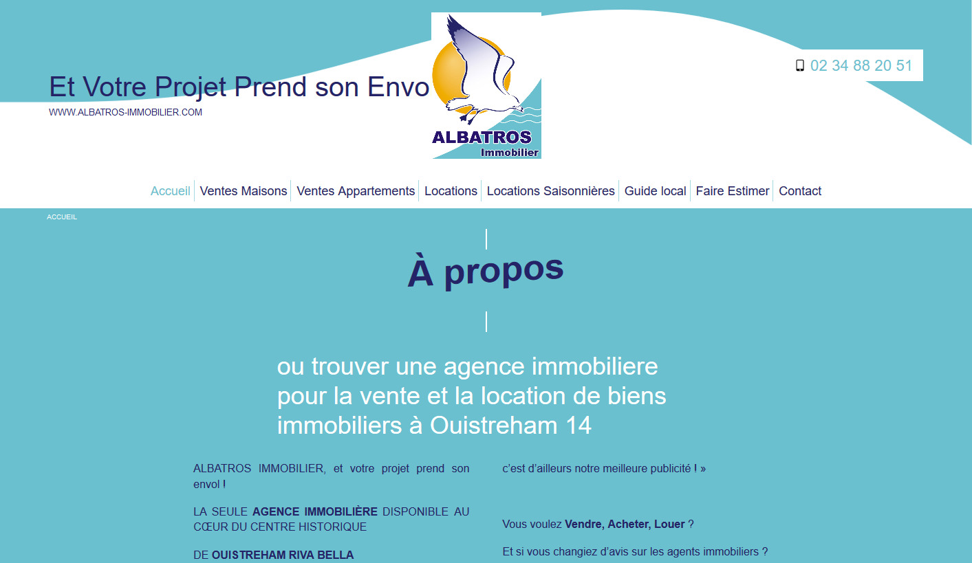 Agence immobilière située à Ouistreham en Normandie, Albatros Immobilier a confié la création de son nouveau site à Jalis. Une mise en avant des biens et de leur prestige est réalisée grâce à la possibilité d'ajouter des images en haute définition. De plus, ce client profite d'outils de référencement exclusifs, lui permettant de se positionner en bonne place sur les moteurs de recherche.