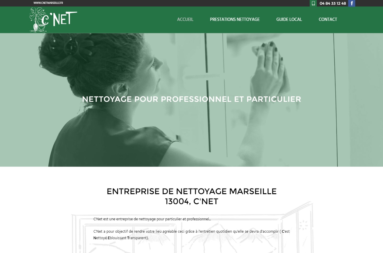 Nous vous présentons le site web de C'Net, société de nettoyage à Marseille, qui a choisi une solution eCard pour être présent sur Google et les autres moteurs de recherche. C'est un commercial digital® avec une rubrique qui lui permet de parler de son activité d'entretien, auprès des particuliers mais aussi des professionnels. Située aux Chartreux, l'entreprise travaille principalement dans le centre-ville et jusque dans le 12ème arrondissement. Son référencement local va l'aider à toucher cette cible.