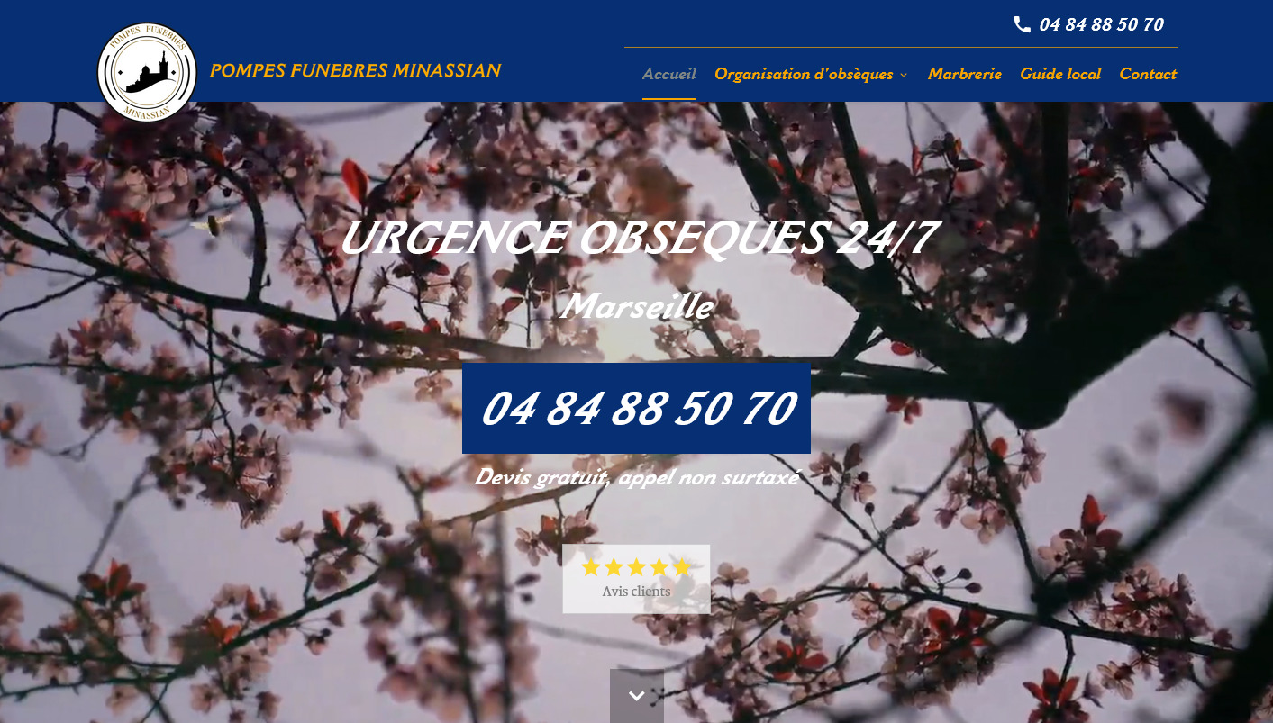 Organisation de funérailles religieuses ou civiles, vente de marbrerie funéraire (monument, plaque, livre, etc.), cérémonie d'inhumation ou d'incinération, aide et soutien dans les démarches et formalités administratives, service d'entretien des tombes et caveaux, etc. : à Marseille Saint-Pierre, les Pompes Funèbres Minassian mettent leur professionnalisme à votre service et vous accompagne dans les étapes qui précèdent et suivent les obsèques de vos proches.