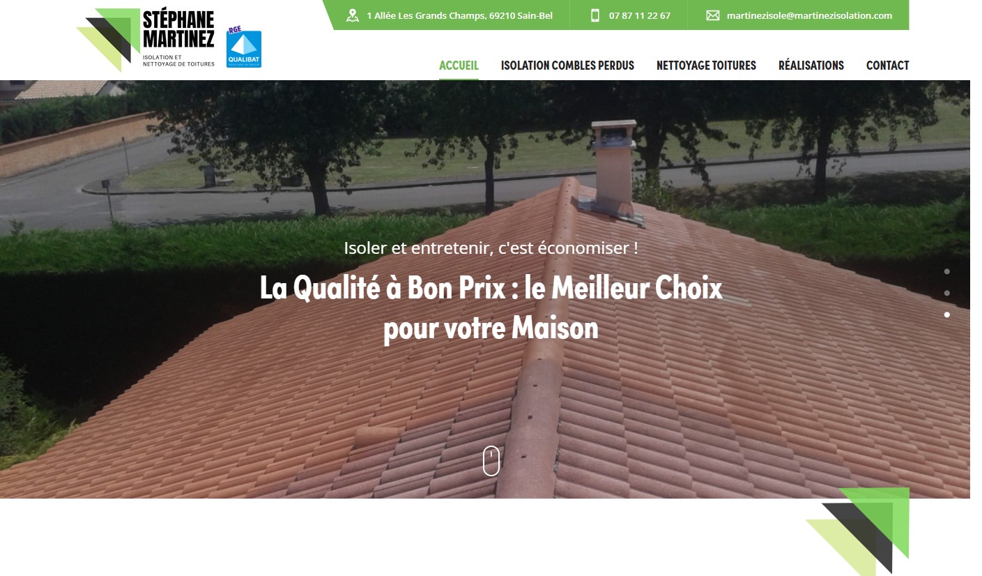 L'entreprise RGE Qualibat dirigée par Stéphane Martinez est une référence dans le domaine de l'isolation thermique sur L’Arbresle et sa périphérie. Un site de la gamme essentiel permet au client de valoriser ses activités. Le site internet est conçu sur mesure et à l'image de l'entreprise. En tant qu'artisan, un site web permet de présenter de manière visuelle ses réalisations et travaux d'isolation. Stéphane Martinez souhaite développer son activité d'isolation des combles ainsi que le traitement des toitures. Grâce à une certification RGE, l'entreprise se positionne comme acteur incontournable sur L’Arbresle et ses environs.