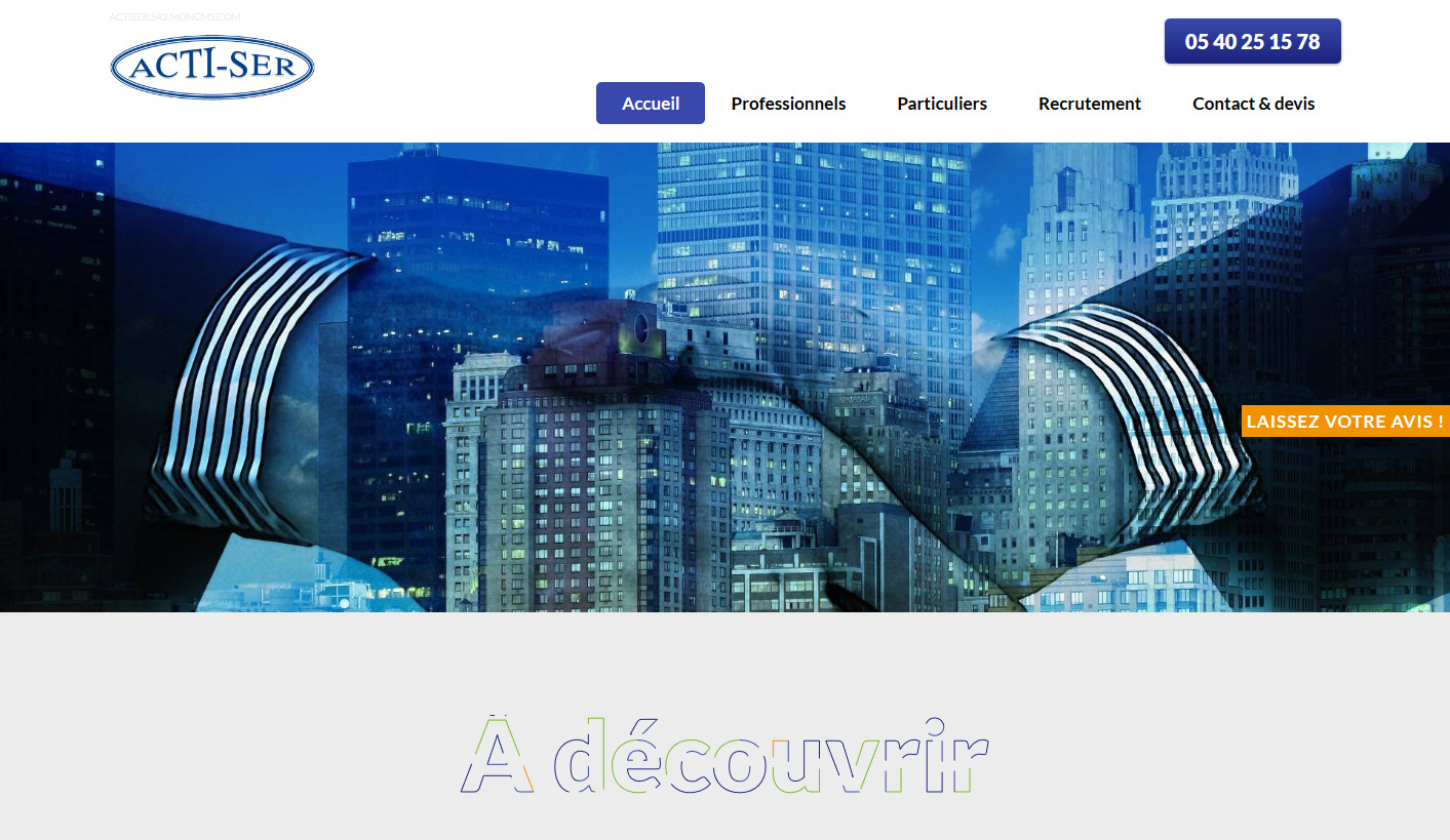 L'entreprise ACTI-SER nous a choisi pour développer sa communication web. Elle propose une équipe qualifiée pour le nettoyage de tous vos locaux professionnels sur Bordeaux et ses alentours. Faites appel à ses services pour l'entretien de vos sols, le nettoyage de copropriétés, de magasins ou encore de bureaux.