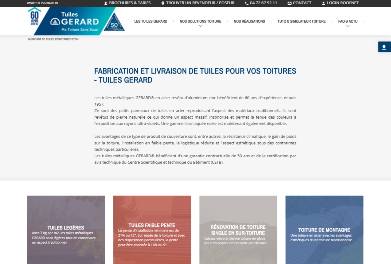 Les Tuiles Gérard® est une société au rayonnement national et international, il lui fallait donc bien un site web complet lui permettant de présenter de manière efficace son activité, son savoir-faire, ses produits et ses services.