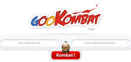 A ma droite, votre site internet. A ma gauche, celui du concurrent. Faites sonner le gong et les 2 adversaires se lanceront dans un combat acharné qui se terminera forcement par un KO. Une idée sympa mais surtout des infos précieuses pour optimiser votre site internet. Après une petite animation, vous obtiendrez en effet un comparatif de la visibilité des 2 sites. Les critères ? GooKombat s'appuie sur le ratio entre les mots-clés positionnés dans Google et le nombre de requêtes générées du côté des internautes mais aussi le nombre d'URL indexées. Les statistiques du combat vous permettent une première analyse de votre adversaire direct, aussi bien en matière de référencement naturel que sur le référencement payant. Une mise à jour régulière est faite pour des résultats optimums : tous les mois pour ce qui est des données de positionnement, tous les 2 mois pour les informations sur le volume de recherche des internautes.