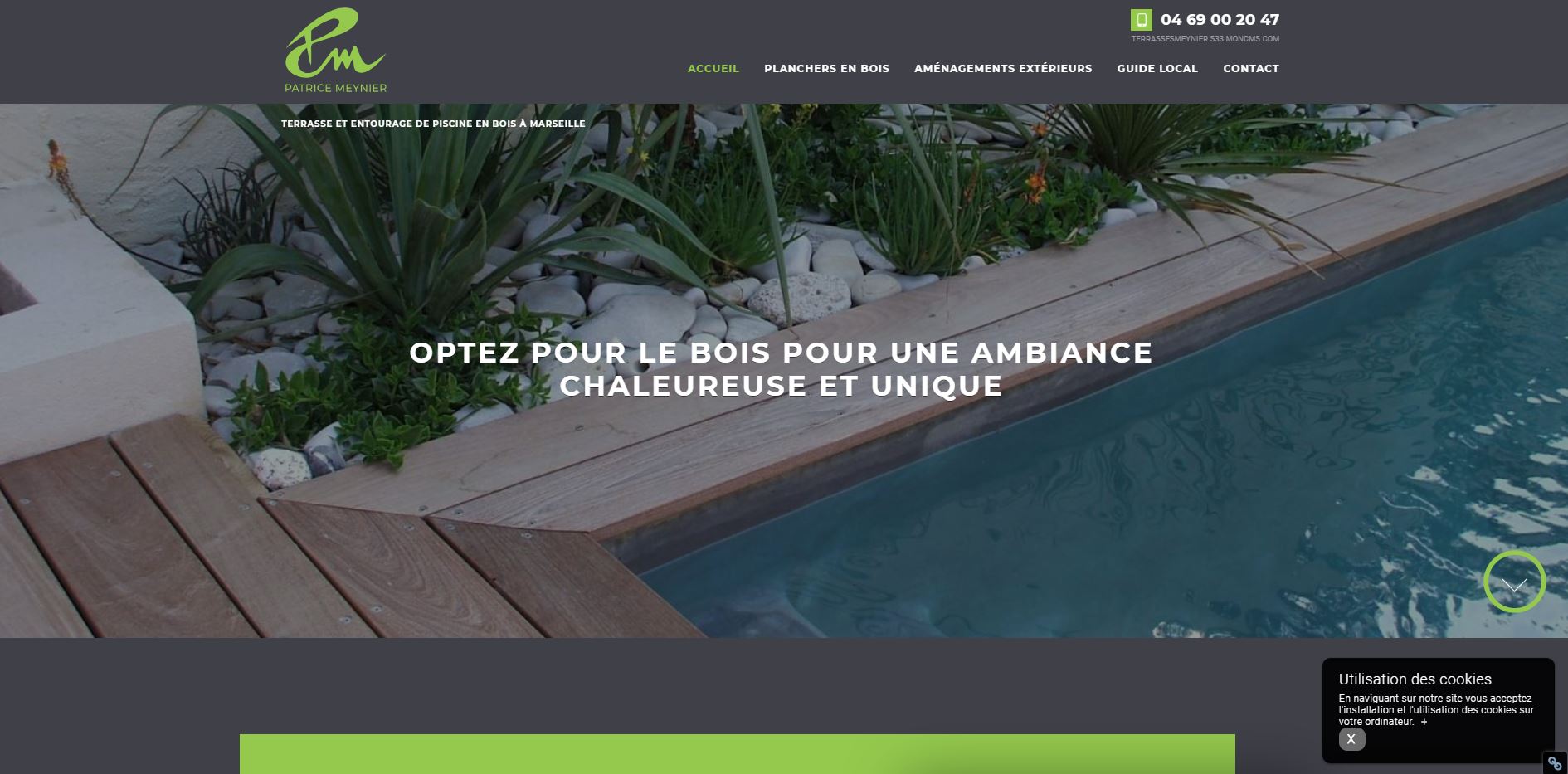 Patrice Meynier est un spécialiste des sols en bois qui demeure à votre service pour la réalisation de terrasse sur-mesure. Terrasse suspendue en pin, installation parquet massif ou création de plage de piscine en ipé à Marseille : le champ d'action de cet artisan est large et vous assure des fabrications entièrement sur-mesure, de qualité professionnelle et à l'esthétique incomparable. Pour découvrir les prestations de Patrice Meynier et faire votre demande de devis, consultez son commercial digital® mis à disposition par Jalis.