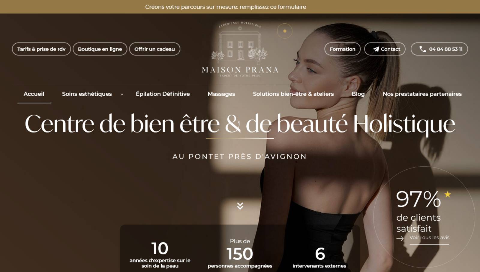 Jalis a créé le site internet de Maison Prana à Avignon, optimisé pour le référencement sur Google. Ce site offre une visibilité accrue aux prestations de soins corps et visage de l'institut, tout en mettant en valeur ses services de qualité. Grâce à une stratégie SEO sur mesure, Jalis a assuré un positionnement optimal pour attirer davantage de clients à la recherche de soins esthétiques à Avignon, et permettre à Maison Prana de se démarquer dans son domaine.