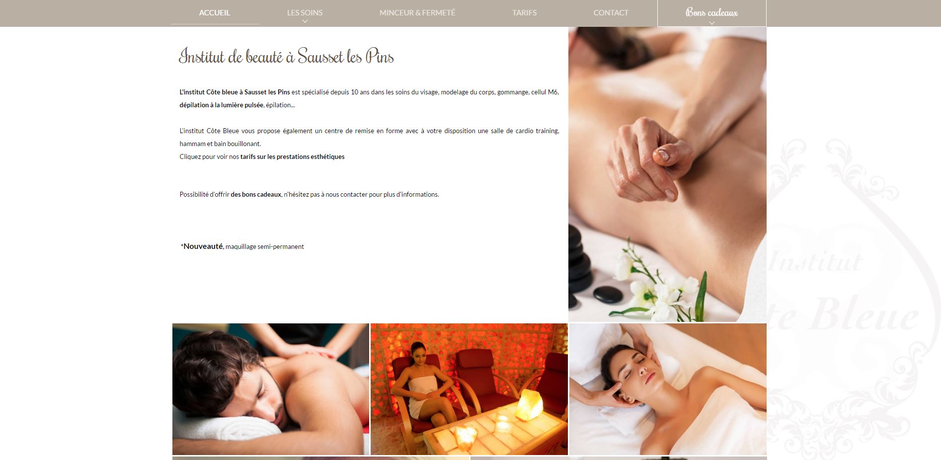 L'institut de beauté Institut Côte Bleue à Sausset les Pins dans les Bouches-du-Rhône vous laisse découvrir à travers son site internet ses diverses prestations. Profitez des bons cadeaux détente sur Sausset et bien d'autres encore pour faire plaisir à vos proches. Modelage, gommage, manucure ou encore soins du corps, vous ne serez pas en reste.