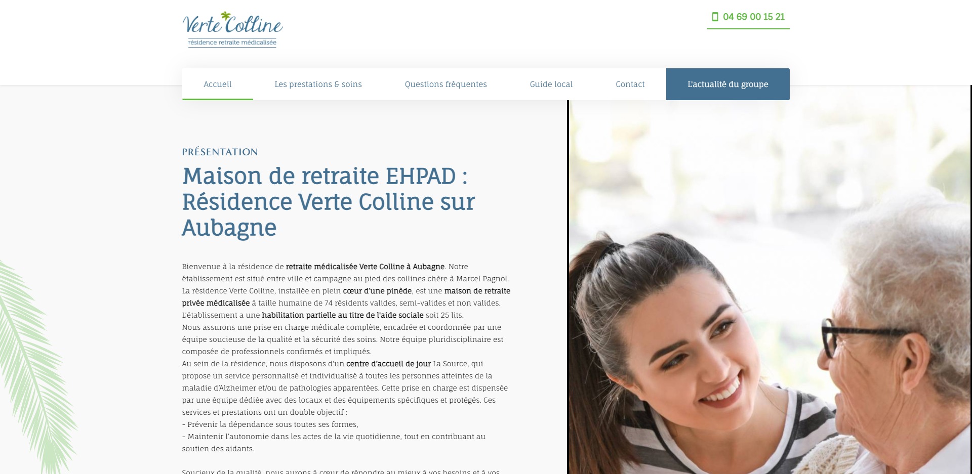 Vous êtes à la recherche d'une maison de repos médicalisée, d'une maison de retraite EHPAD ou d'un accueil de jour près de Marseille ? L'établissement Verte Colline est une maison de retraite médicalisée sur Aubagne, au coeur d'une pinède. Cet établissement privé offre aux personnes âgées valides et en perte d’autonomie de nombreuses prestations : blanchisserie, service en chambre, restauration et animations quotidiennes. Il propose une prise en charge médicale complète par des professionnels confirmés : aide-soignants, médecins infirmiers, aides médico-psychologiques ou encore ergothérapeutes.
