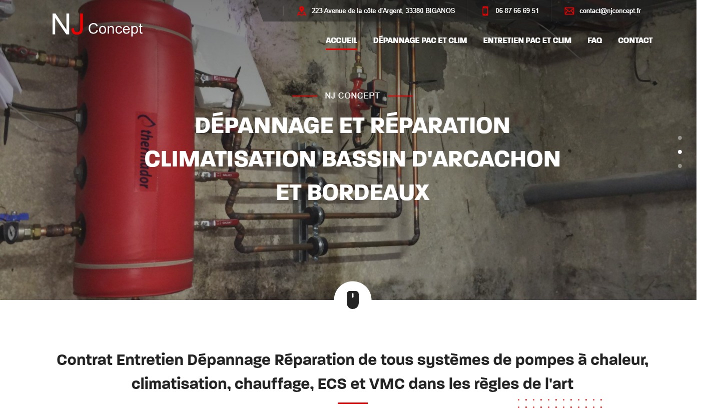 NJ Concept réalise le dépannage, l'entretien et la maintenance de climatisations. Les contrats d'entretien sur le Bassin d'Arcachon sont l'une des activités phares de l'entreprise. Les techniciens interviennent sur toutes les marques de climatisation et PAC. A travers ce nouveau site internet, NJ Concept souhaite cibler aussi bien les particuliers que les professionnels. Le site va permettre de favoriser le développement de l'activité encore récente (1 an).