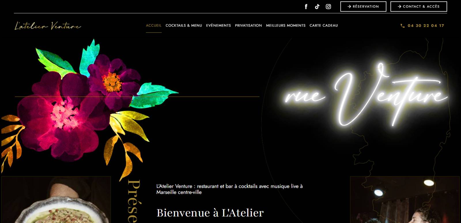 Jalis a conçu un tout nouveau site internet pour L'Atelier Venture, restaurant festif au cœur de Marseille centre-ville. Ce projet web a été pensé pour refléter l’identité unique de l’établissement, où gastronomie et ambiance musicale fusionnent pour offrir une expérience immersive. Le site met en avant l’univers du restaurant, ses plats à partager inspirés de la cuisine méditerranéenne et corse, ainsi que son atmosphère conviviale et festive. Le site permet aux visiteurs de découvrir la carte, réserver une table et s’immerger dans l’expérience Atelier Venture avant même de franchir les portes du restaurant.