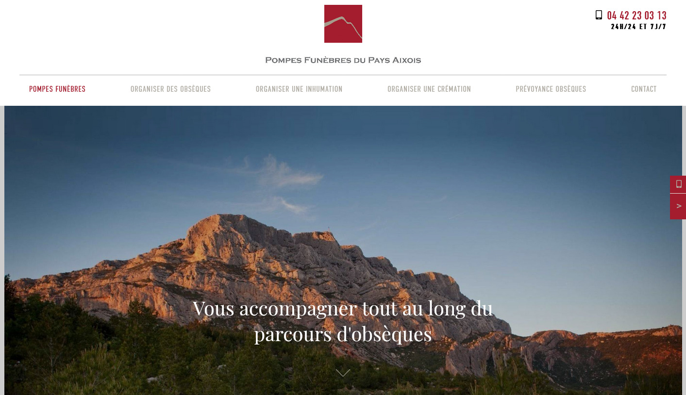 Les Pompes Funèbres du Pays Aixois vous accompagnent dans les diverses démarches à réaliser lors de la perte d’un proche. Elles vous aident à organiser une cérémonie personnalisée qui vous permettra de rendre un dernier hommage à la mémoire du défunt. En cas de besoin, elles réalisent également le transport funéraire, la réduction de corps ou encore des faire-parts de décès.