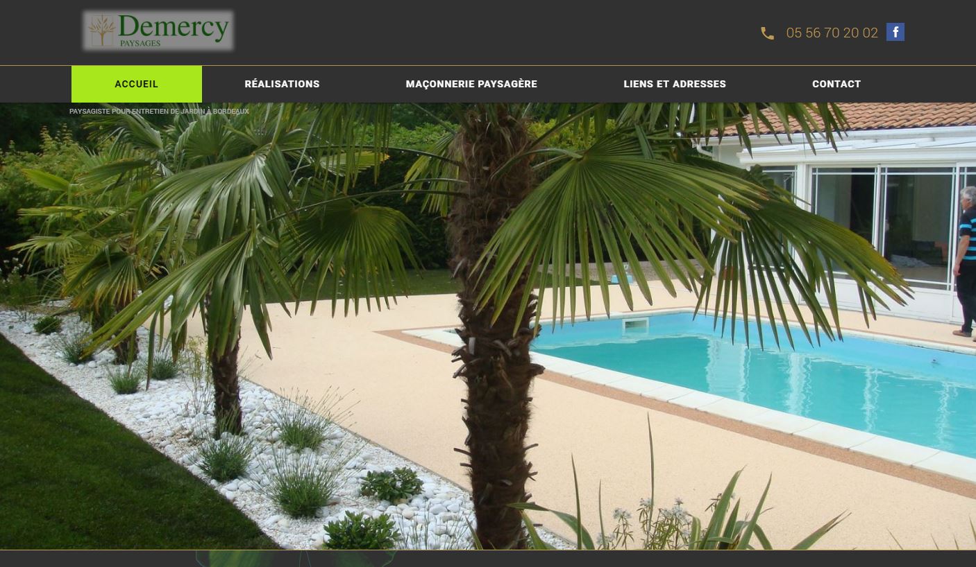 Installée dans le Médoc, la société Demercy Paysages conçoit des jardins uniques, faits sur mesure pour les particuliers et les entreprises. Faites appel à l’entreprise spécialiste de la maçonnerie paysagère à Bordeaux pour la conception de vos murs de traverses en pierres ou en bois, la pose de pavés ou l’aménagement de votre jardin.
