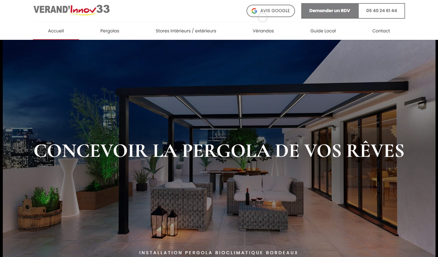 Verand'Innov nous a fait confiance pour la mise en place de son espace web. Ces experts sont à disposition pour la pose de véranda sur mesure sur Bordeaux et l'ensemble du bassin d'Arcachon. Vous pourrez également profiter de leur savoir faire en matière de stores et de pergolas pour l'extérieur de votre maison. La société a d'ailleurs récemment opté pour un site dédié à la fabrication et l'installation de pergolas à Bordeaux. Voyant son activité se développer et prendre de l'ampleur grâce à la solution Jalis, Vérand'Innov 33 est parti sur une stratégie multi-sites afin d'optimiser son référencement sur les vérandas d'un côté et les pergolas de l'autre. A découvrir !