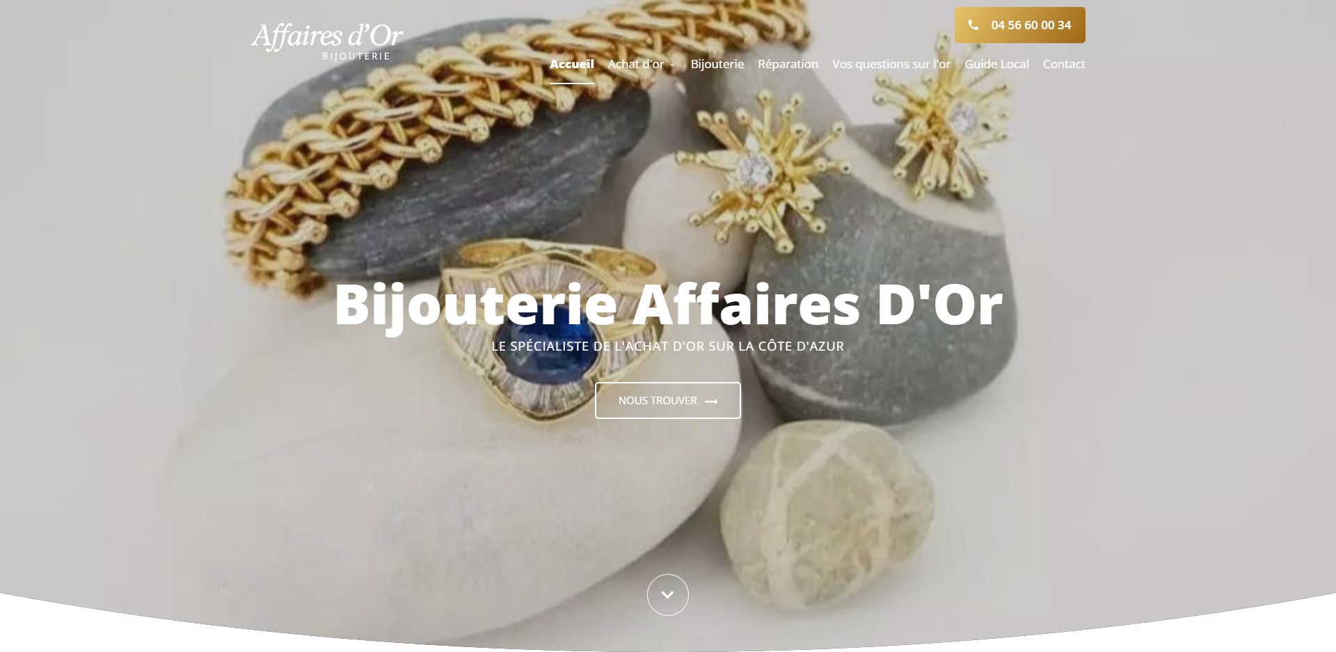 Affaire d'Or est une bijouterie située à Nice, son site a été réalisé de manière à ce qu'il soit le plus optimisé possible, en matière de rapidité et d'acquisition de contacts.