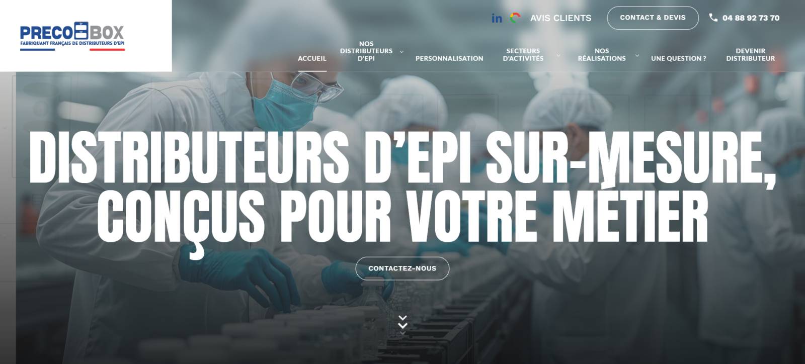 L’agence web et SEO Jalis a assuré la conception complète du site PRECOBOX, dédié à un fabricant français spécialisé dans les distributeurs d’équipements de protection individuelle (EPI) en plastique rigide. Ce site met en avant un savoir-faire unique dans la création sur mesure de solutions de rangement hygiéniques, conçues pour répondre aux exigences des secteurs pharmaceutique, hospitalier, agroalimentaire, industriel et de la recherche.