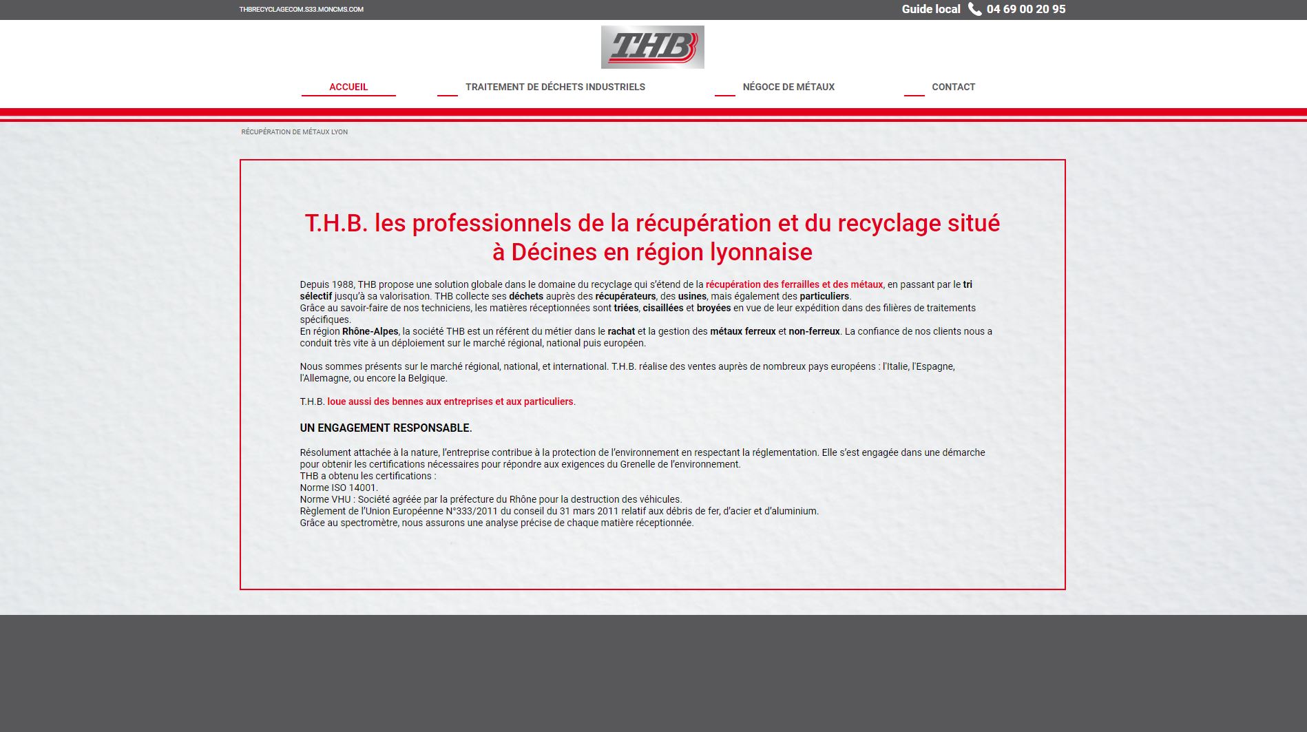 Pour les professionnels comme pour les particuliers, THB s'est spécialisé dans la récupération de déchets dans le Rhône (69). De la collecte au tri en passant par la valorisation, THB recycle des matières et produits issus de l'industrie comme les peintures, les huiles, les métaux ou même les véhicules hors d'usage. Soucieux de l'environnement, THB permet à des matériaux autrefois laissés à l'abandon après leur utilisation de retrouver une nouvelle vie et prend soin de l'environnement en assurant un recyclage selon différentes normes en vigueur.