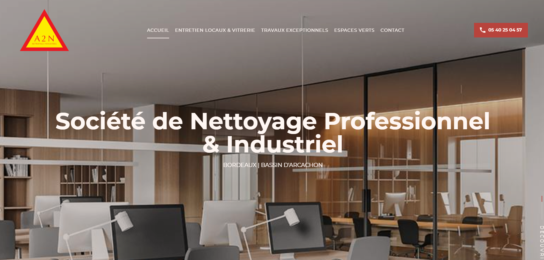 A2N est une entreprise de nettoyage industriel situé en Gironde et qui propose des prestations de ménage et de nettoyage de locaux professionnels. En proposant des solutions de ménage avant et après les heures de bureau, ou en s'occupant de nettoyage de fin de chantier, ou encore en ayant une équipe dédiée au nettoyage de vitres de façades à l'eau pure à Bordeaux, A2N se positionne comme un acteur incontournable du nettoyage de locaux commerciaux, magasins et entrepôts en Gironde.