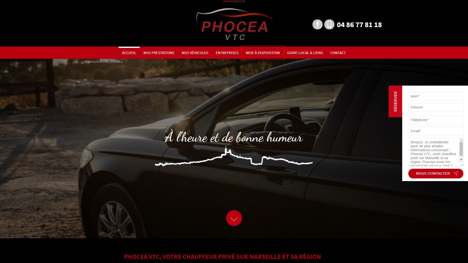 Phocea VTC est une société qui propose des services de chauffeur privé pour vos déplacements sur Marseille et ses alentours. Disponibles 7j/7 et 24h/24, elle propose un devis fixe, en fonction du nombre de kilomètres à parcourir. Choisissez votre véhicule VTC récent (mercedes, BMW, C5 et bien d'autres) pour votre transfert depuis ou vers la gare Saint Charles, l'Aéroport Marseille Provence, le Dôme pour un concert ou encore pour un rendez-vous professionnel. Des prestations haut de gamme vous sont proposés, avec la climatisation, un chargeur de téléphone, de l'eau et même des friandises ! Réservez votre chauffeur VTC sur le site.