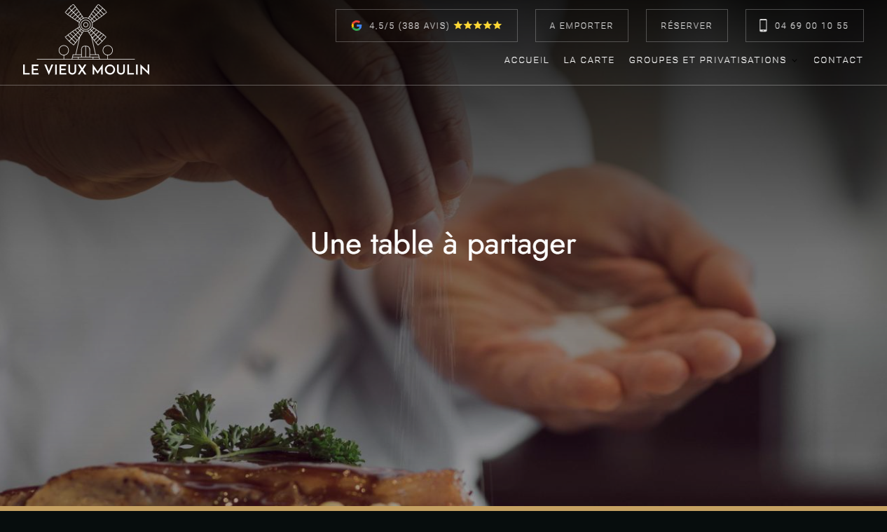 Idéalement placé dans le centre de Marseille, le restaurant le Vieux Moulin vous accueille pour une halte gourmande le midi ou le soir. Avec son service de privatisation de salle, Le Vieux Moulin vous permet de réserver pour un repas de groupe à Marseille et ainsi y tenir un repas dans le cadre d'un mariage, d'un anniversaire, d'un séminaire et de tout autre évènement, qu'il soit d'ordre privé ou professionnel. D'autre part, vous pourrez retrouver différentes animations et soirées à thème qui vous y seront proposées régulièrement.