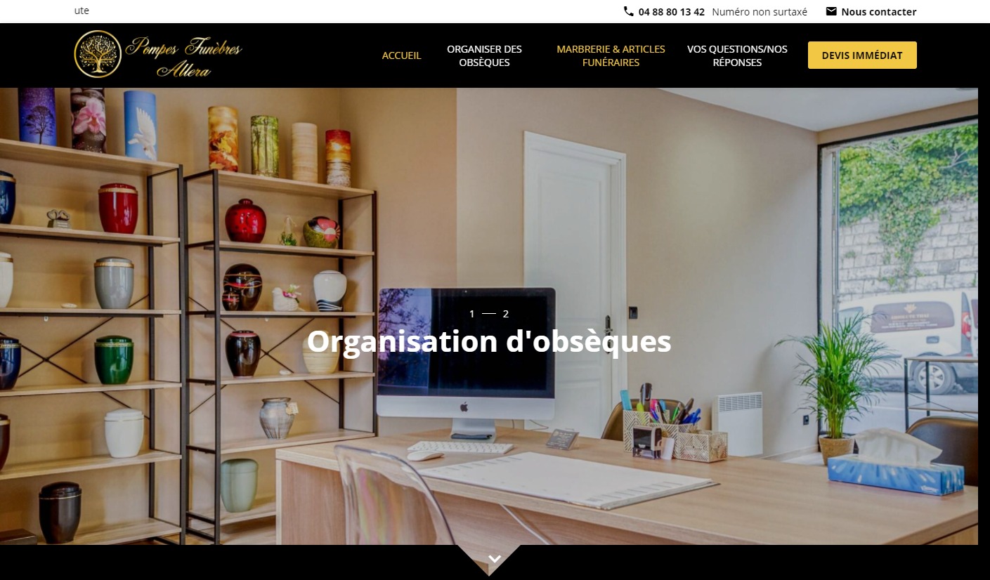 Les pompes funèbres Allera sont situées à Grasse et spécialisées pour accompagner l'entourage lors de l’organisation d'obsèques. L'entreprise de pompes funèbres fait confiance à Jalis pour réaliser la conception du site de A à Z. Le site permet de prendre RDV en agence avec le formulaire de contact, mais également demander un devis. Tous les services de l'agence sont présents sur le site ainsi que des retours clients. Le site bénéficie d'une géolocalisation sur des secteurs stratégiques pour le client.