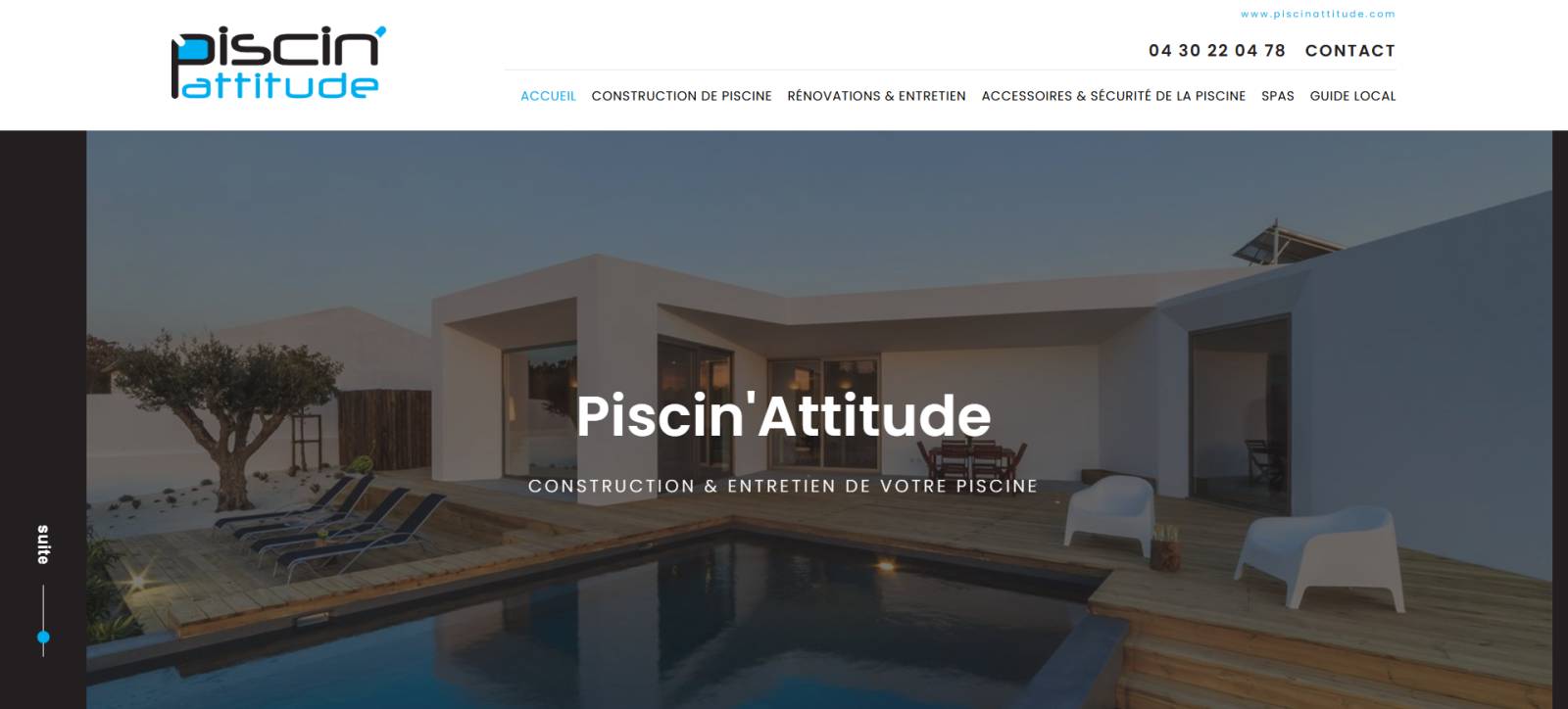 Pour la conception d'un site sur-mesure, Piscin'Attitude a fait appel à Jalis. Jalis a conçu le site Internet de l'entreprise (en s'occupant également de son hébergement) et a effectué un travail de référencement pour mettre en avant les prestations de Piscin'Attitude sur les moteurs de recherche : construction de piscine traditionnnelle à Villefranche-sur-Saône, rénovation de piscine, vente d'accessoires de piscines, etc. Cette entreprise crée et pose des piscines à Lyon et sa région. Grâce à une équipe professionnelle, l'équipe effectue des tests et des mesures puis crée la piscine dont le client a toujours rêvé. Découvrez leurs prestations et leurs réalisations sur le site internent : www.piscinattitude.com