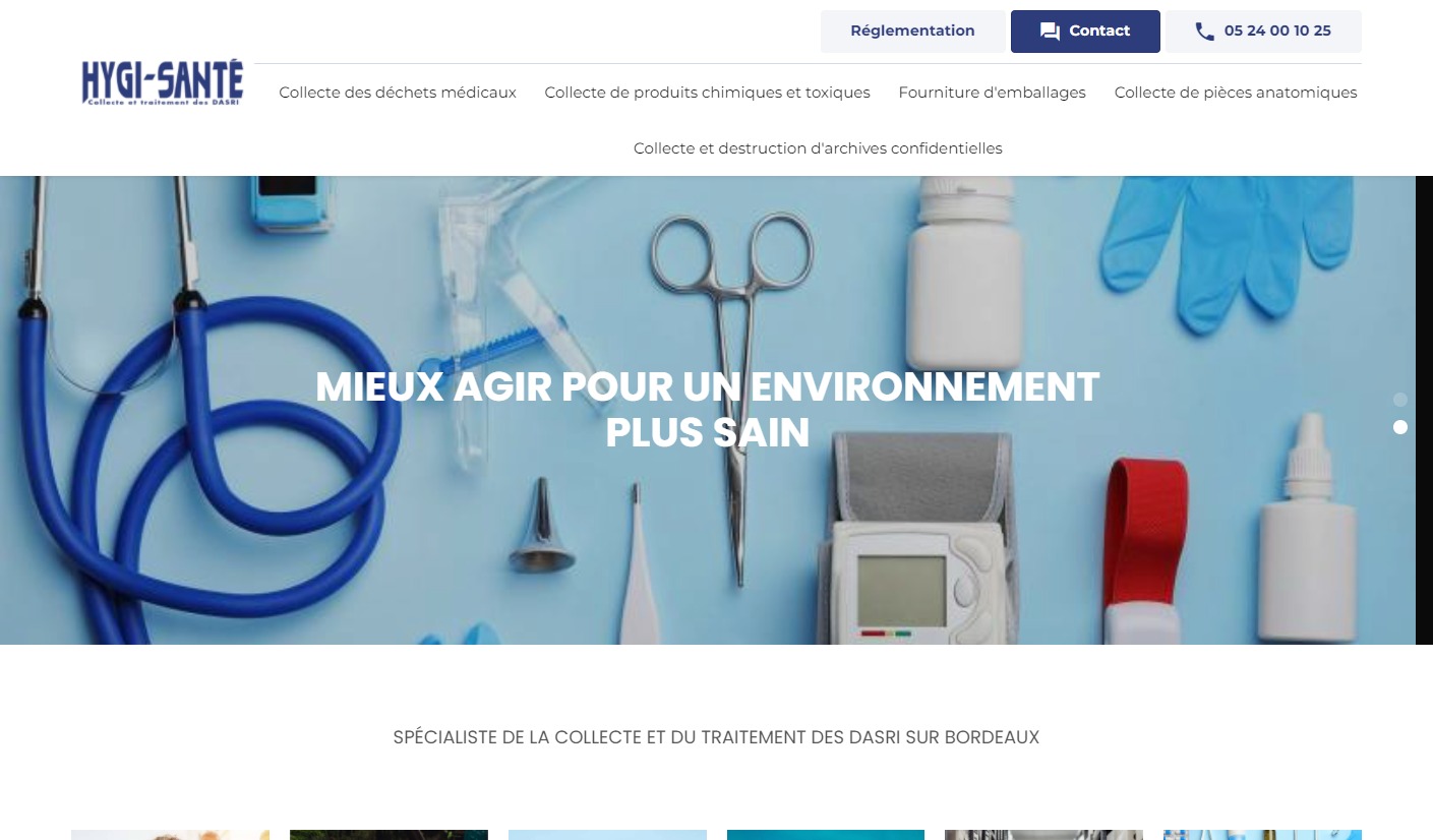 Depuis plus de 10 ans en Aquitaine, Hygi-Santé accompagne les professionnels de santé et les établissements médicaux dans la collecte, le traitement et la destruction de leurs DASRI, déchets chimiques et toxiques et pièces anatomiques. Le site internet présente l'ensemble des activités du client. Le design reprend les codes couleurs du secteur médical pour se positionner au mieux par rapport à la cible client. Hygi-Santé fait appel à Jalis afin d'obtenir plus de visibilité sur la région Aquitaine et ses principales villes : Bordeaux, La Rochelle, Bayonne, Poitiers.