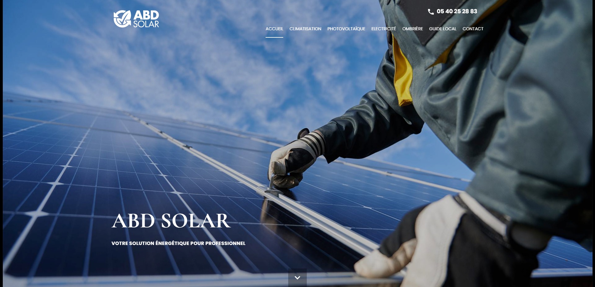ABD Solar a choisi Jalis comme partenaire pour promouvoir son entreprise spécialisée en installation de panneaux photovoltaïques et solaires, pose de réseaux électriques et climatisations pour les professionnels à Toulouse et alentours. Notre équipe spécialisée dans le référencement naturel a créé un site web optimisé qui met en valeur la spécialité de l'entreprise ainsi que la zone géographique qu'elle dessert. Grâce à un design responsive en plein écran, nous mettons en avant les offres actuelles et offrons un outil innovant pour améliorer le référencement SEO du site. Vous aussi, découvrez la puissance de Jalis et confiez-nous la conception de votre site internet. ABD Solar a fait appel à nos services pour la création d'un site web dédié à la promotion de son activité de solution énergétique pour professionnels.