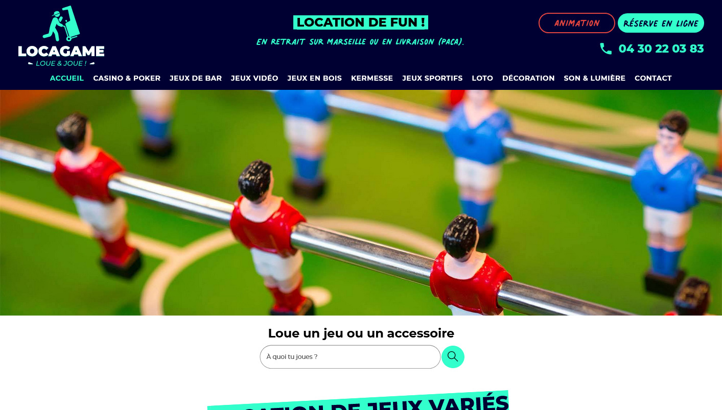 Ce prestataire événementiel s'est spécialisé dans la location de jeux pour les soirées et les événements. Jeux vidéo, tables de casino, jeux sportifs, jeux de société traditionnels en bois ou jeux de bar : vous trouverez tous les équipements dont vous avez envie. Organiser un tournoi de jeux vidéo, mettre en place une salle de jeux éphémère avec billard et babyfoot, faire installer un terrain de foot ou de volley, organiser un loto : Locagame vous permet d'animer tous vos événements autour de Marseille.