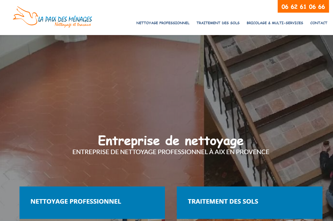 La société La Paix des Ménages intervient dans les Bouches-du-Rhône au service des professionnels et des particuliers depuis 2007. Cette entreprise de nettoyage à Aix-en-Provence propose également la gestion de poubelles ou encore le nettoyage des parties communes. Nettoyage des vitres, traitement de sols, ménage après chantier ou travaux... Retrouvez toutes les prestations de La Paix des Ménages sur leur site internet.